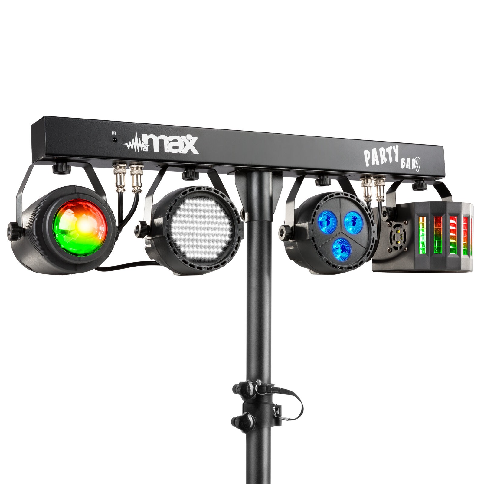 MAX Partybar är en komplett ljusshow på en T-bar. Tack vare det medföljande stativet kan helheten snabbt och enkelt placeras på höjd för att snabbt förvandla ett rum till en festplats. Manövreringen av Partybar är mycket enkel med den medföljande fjärrkontrollen så att alla kan använda den utan problem. Om du inte vill ha något krångel, använd bara ett av de inbyggda programmen eller låt det vara med på musik. För musikdrivet läge har effekten en inbyggd mikrofon.